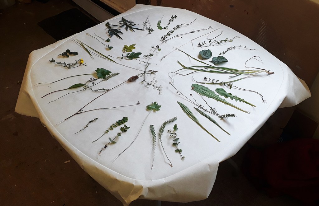 When I think about the patch on Fackenden Down that I have worked with during This Vibrant Turf, it really feels as I have barely scratched the surface, and that the images and videos and rubbings and writings really don’t do it justice… I don’t mean that in an art criticism kind of way, but in considering what it might take to really connect, to this patch, to its plants. To know a patch of turf one must really learn it over a whole year, don’t you think, through all the seasons? And then, of course, things change, so the year after, the patch will have a slightly different group of plants and insects and microorganisms, each with their own unique signature, or song. Within each species there is so much variation. Each plant is an individual, much as each human is, but plant individuality usually only gets noticed by humans in very exceptional cases, like veteran and ancient trees. Or, perhaps, the plants in one’s own garden, the places that you tend, and visit, and ponder again and again and again…the plants that you care for. I haven’t quite got there yet with the patch. I have seen some plants flower and seed, and now they are dying back. After we had a long dry spell and then rain in September, there was also a period of fresh new growth, like a mini Spring. Some Scabious plants flowered, that I had missed flowering earlier in the year, and also there were lots of new fresh dandelion leaves. I wish I had eaten some. I picked two leaves from each species of plant, to make this ‘tablecloth’ photo and do some rubbings, but I felt a bit bad even doing this, because it’s a nature reserve, but after all they manage the site with cattle. I want to deepen my connection to these plants, and I think that eating them, becoming corporeally enmeshed, would help.